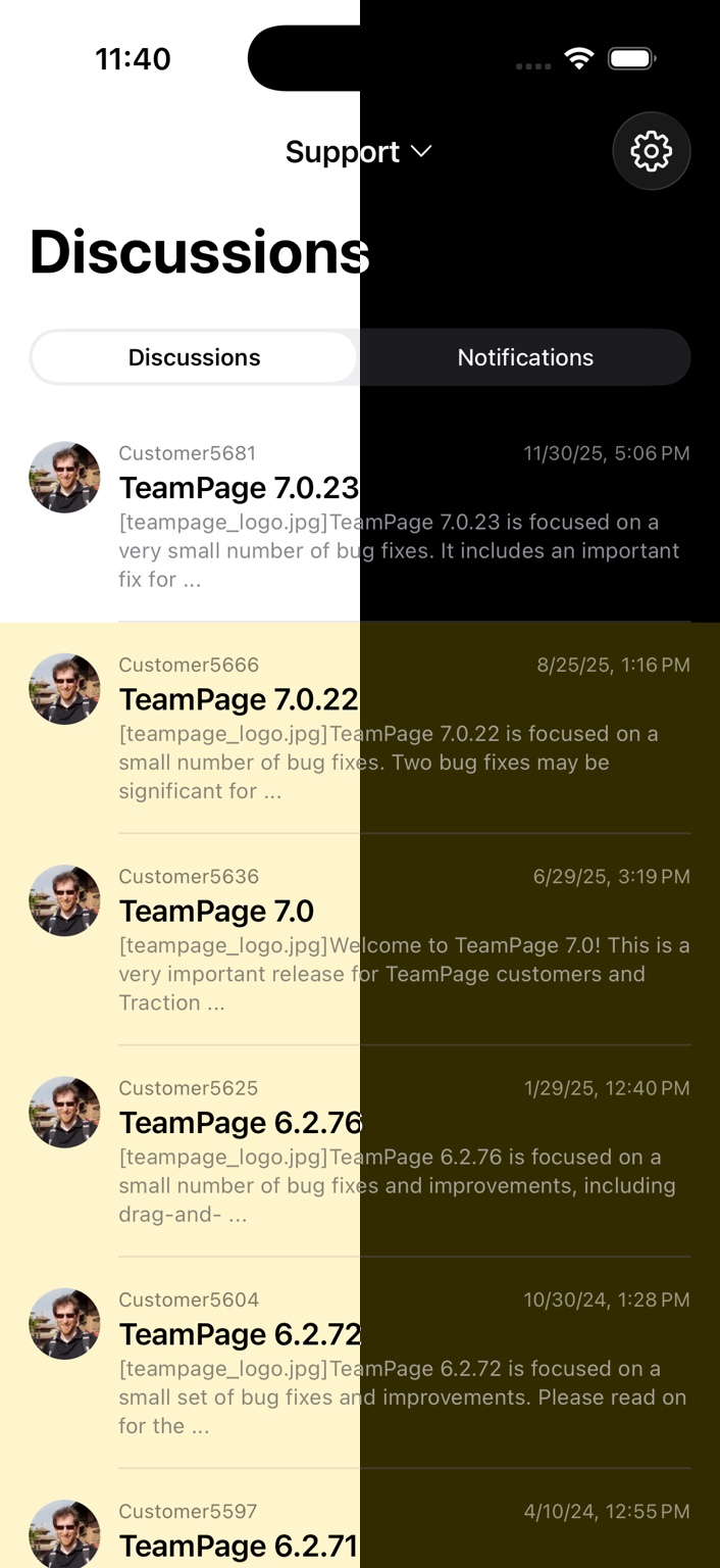 • A toggle switch lets you move between the native discussion view and the full live TeamPage web interface. The app remembers your preference so you can stay in your preferred view as you navigate.